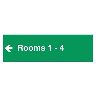 E913 : Left arrow (90 deg supplimentary) This sign is made from plastic semi-rigid 1mm 1mm thin plastic sign, can be screwed, stuck with adhesive, or attached with cable ties. Not suitable for hanging. 4mm Corner holes Landscape Letterbox Sign Text: Rooms 1 - 4