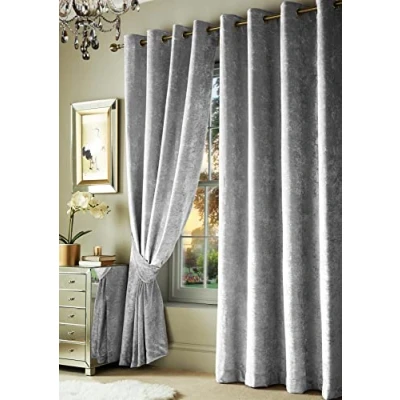 INTRODUCING our crushed velvet eyelet curtains, the perfect addition to your home. Sold as a pair (2 panels), these curtains come in a range of deep, solid colours - to suit any decor. The tiebacks included with the curtains allow you to easily adjust the amount of light and privacy in your space. FULLY LINED - curtains are designed to reduce the light and noise, making them perfect for use in bedroom, living room, office, and other spaces where you want to create a peaceful and restful atmosphere. The lining also helps to protect the crushed velvet fabric from fading and wear, ensuring that these curtains will stay looking beautiful for years to come. CRUSHED VELVET texture can cause the fabric to reflect light differently depending on the angle and intensity of the light source. In some lighting conditions, the fabric may appear to have a deeper, more saturated colour, while in other lighting conditions it may appear lighter or more muted. The reflective properties of crushed velvet fabric can also create a subtle shimmer or sheen, which can add visual interest and depth to the fabric. TO CARE for your crushed velvet curtains, simply spot clean or dry clean as needed. Avoid washing or drying these curtains, as the heat and agitation can damage the delicate fabric. By following these simple care instructions, you can enjoy these beautiful curtains for years to come. WHETHER YOU'RE LOOKING to update your own home or searching for the perfect housewarming gift for a loved one, these crushed velvet eyelet curtains are sure to impress. Fabric: 100 Percent Crushed Velvet (+ Micro polyester lining). Each pack contains 2 panels and the tiebacks. Care instructions: Dry Clean Only
