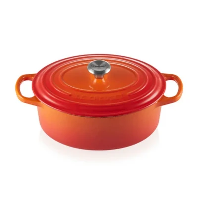 With a 4.1 litre capacity, this Le Creuset Signature Volcanic Cast Iron 27cm Oval Casserole is the ideal size when cooking for 4-6 people. Just as versatile as Le Creuset’s round casseroles, this oval version cuts down on the space taken up in the oven. It can also be used on all types of hob, including induction, or under a grill.The cast iron construction is excellent at retaining heat, resulting in even cooking and browning. It will also keep cooked food warmer for longer when serving at the table. The tight fitting lid also helps the cooking process by locking in moisture and enhancing flavour.The light enamel interior makes cleaning easier whilst the large handles are easy to grip when lifting the casserole, even when wearing oven gloves. The heat resistant knob (oven safe up to 260°C) also provides a better grip when wearing oven gloves or mitts.Handcrafted at the Le Creuset foundry in northern France since 1925, Le Creuset casseroles are made from premium quality cast iron ensuring each product is beautifully finished and long lasting. A true kitchen essential, the cast iron oval casserole is not only perfect for making casseroles, stews and one pot roasts, but is versatile enough for baking cakes and bread. Le Creuset cast iron cookware also works efficiently at low to medium cooking temperatures and retains heat effectively, ensuring food stays warm for longer.Le Creuset cast iron casseroles are suitable for all hob types (including ceramic, halogen, induction, gas and oil or wood). They are also dishwasher safe although we would recommend hand washing.The Le Creuset 27cm oval cast iron casserole is ideal for 4-6 people and has a capacity of 4.1L. Dimensions: L35.2cm x W22.6cm x H15.4cm. Weight: 4.43kg.The Le Creuset Signature Volcanic Cast Iron 27cm Oval Casserole is supplied with a lifetime manufacturer's guarantee.