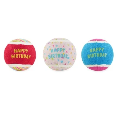 BIRTHDAY TENNIS BALLS FOR DOGS: Colourful, celebration-themed dog toy balls designed for birthday fun; a cheerful way to treat your dog on their special day PACK OF 3 SQUEAKY BALLS: Includes three tennis balls with built-in squeakers to engage and entertain dogs of all breeds and sizes GREAT FOR FETCH & TRAINING: Lightweight and bouncy for classic fetch games in the garden, park, or living room – a fun way for your dog to exercise and burn energy GIFT-READY FOR BIRTHDAYS: A thoughtful birthday gift for your dog or fellow dog lovers, designed to suit celebratory occasions and pet parties FITS MOST STANDARD BALL LAUNCHERS: Designed in a standard tennis ball size, these dog toy balls are compatible with most dog ball flingers and launchers for outdoor play