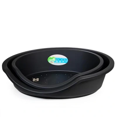RECYCLED PLASTIC: Made from at least 70% post-consumer recycled plastic (except rubber feet) - equivalent to 35 x 1L bottles. EASY TO CLEAN: Durable, washable, and hard-wearing bed for medium to large dogs. DESIGN: Ergonomic design, with rubber, non-slip feet for use on hard floors. VENTILATED BASE: Vents in the base help keep bedding fresh and can be used with or without a towel, blanket, or mattress such as Rosewood All Seasons or Tough and Mucky 81cm mattress for size 95cm plastic dog bed. DIMENSIONS: Max external dimensions 94 x 70 x 29cm / Internal floor dimensions 77 x 56cm (available in 3 sizes).