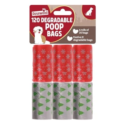 FESTIVE CLEAN-UP MADE FUN: Includes 120 dog poo bags across 6 refill rolls for quick, hygienic waste disposal during walks or at home - featuring two playful Christmas designs CONVENIENT TIE HANDLES: Each bag features strong, easy-to-use tie handles for quick and secure closure, making dog walks and cleanups hassle-free FITS MOST DISPENSERS: The compact roll size fits most standard dog poo bag dispensers for easy access on the go BIODEGRADABLE DESIGN: Made from biodegradable materials, these bags are a cleaner choice for the planet while keeping your routine mess-free GREAT FOR SEASONAL GIFTING: A fun and practical gift for dog owners during the holidays, combining everyday usefulness with festive flair