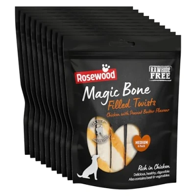 JoybuyRosewood Magic Bone Filled Twists Chicken and Peanut Butter Flavour Dog Treats are rawhide-free, dual-flavour snacks for dogs over 9 months, featuring over 45% real chicken, fruits, and vegetables, with a unique twisted shape to help clean teeth and individually packed pieces for freshness and convenience.