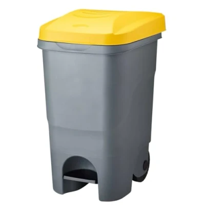 Grey polypropylene body. Carry handle Wide front pedal. Plastic rods. Smooth wheels. Delivered unassembled (only FP) Ideal for sorting and waste management. Easy transport and mobility. Durable and easy to maintain 53 x 40.5 x 67.5 cm Full back flip-over colour lid Capacity: 60 litres