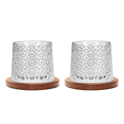 Rotatable Old Fashioned Glass Cup, 275ml/10oz Crystal Whiskey Set of 2, Wood Coaster, Thickening, Used as Rum Glass, Cocktail Coffee Milk Cup to Relax and Reduce Stress