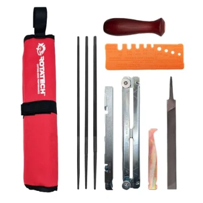 Rotatech Chainsaw Chain Sharpening Kit. Sharpener with 5/32" (4mm), 3/16" (4.8mm) & 7/32" (5.5mm) Round Files, Handle, Flat File, Filing Guide Pouch.