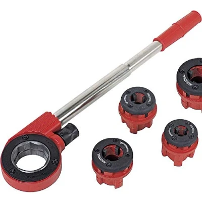 Tapping clamp set with 4 die heads For threading BSPT right; Ratchet lever split (2-piece handle), with 8-sided direct mount; Secure hold of die heads; Easy insertion and removal; Faster cutting due to extended chip ejection chambers; Reinforced locking ring and precise die seat; Small serrations and reduced ratchet angle For making precise threaded pipe connections Power saving due to lever function; Handy, lockable change of ratchet direction; Perfect centering; Optimized cutting geometry enables easy gate and excellent chip flow; In plastic carrying case 1x plastic case; 1x tapping ratchet; 1x die head 1/2"; 1x die head 3/4"; 1x die head 1"; 1x die head 1 1/4"; 1x ratchet lever - 2-piece