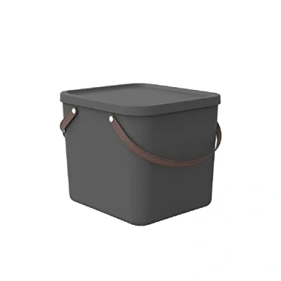 AmazonDesign oriented and sustainable: large storage box with lid and handle - perfect for systematic storage of things in children's rooms, bathrooms, kitchens etc. - Made from recycled plastic Universal and modular: can be used individually or as a set - box available in two different sizes (25, 40 litres) - safely stackable - beautiful design that can also be used in the living area Space-saving and practical: stackable boxes – comfortable to carry thanks to carrying straps – easy-care plastic, easy to clean Dimensions: 39.8 x 35.5 x 33.9 cm (L x W x H), capacity 40 litres, practical organiser box with lid and handle, available in various colours Box contents: 1 x 40 litre plastic storage box with lid and carrying strap – container and lid anthracite and brown handle – available in other attractive colours