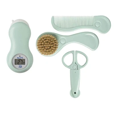 Practical care set for babies from birth: gift set consisting of digital bath and room thermometer, nail scissors with protective cap, comb and natural hair brush Ideal for baby's hair care: brush with extra soft natural bristles, comb with rounded tips - gentle to sensitive scalp and baby's fine hair; clean with soap and water before use Gentle nail care for babies: Practical nail scissors with rounded tips for cutting small fingernails and toenails, incl. protective plastic cap for safe storage, stainless steel cutting surfaces Optimal for baby bath: Thermometer with digital display and suction cup for quick and easy measurement of room and water temperature, Cell battery included, Recommended temperature 35 - 37°C, Switch on by knocking, Automatic switch off Contents: 1 x Rotho Babydesign Care Gift Set: Comb (12.5 x 3.8 x 0.3 cm), Natural hair brush (13 x 5.1 x 2.4 cm), Nail scissors (10 x 5.4 x 0.5 cm), Bath thermometer (12.5 x 5.8 x 2.5 cm), Green (Swedish Green), 21059026601