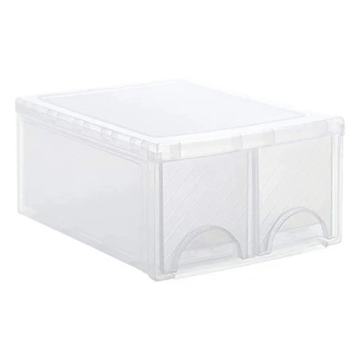 Stackable drawer box with 2 drawers (size inside 41.5 x 14.5 x 15.5 cm (LxWxH) - Suitable for desks, shelves, bathroom & kitchen - Timeless drawer system can be combined with each other as desired Very stable and robust quality - Several drawer boxes can be stacked on top of each other - Drawers can be pulled out completely, even when heavily loaded EXAMPLES OF USE: office box, junk box, storage box for make-up and cosmetics collection, children's toys, jewellery or accessories collection and suitable for the bathroom. SIZE: approx. 44.5 x 34.5 x 20 cm (LxWxH) - Colour: Case and drawer transparent - Material: plastic/plastic (PP) - Can be combined with other system boxes as desired SUPPLY: 1x storage system incl. 2 drawers - storage compartments made by Rotho in Switzerland