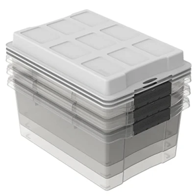 Practical storage boxes with lids in a set of 3. Perfect containers even when space is limited. Contents can be easily identified thanks to the transparent box Safely stackable. Lid is reversible and thus ensures either a secure stand or more space in the box. Stackable box with practical handles and click fasteners Ideal for storing items in A4 format, such as office supplies, craft accessories, toys and more. Stackable and space-saving nesting when the boxes are not in use Set of 3 boxes of 13 L, A4 format, 39.5 x 27.5 x 26.5 cm (L x W x H), transparent stacking box, white lid (mistletoe white) Made from durable plastic in Switzerland