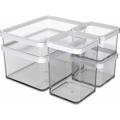 COMFORT: Fresh food storage boxes - Cleaning the plastic boxes in the dishwasher (upper basket) - Transparent storage boxes for multi-person households CLOSURE: Aroma-tight closure of the individual plastic containers - longer shelf life of food - Silicone sealing ring in white - Preservation of aromas. USE: Spacious fresh food storage boxes - no deformation or scratching of the storage boxes after cleaning in the dishwasher - e.g. storage of flour, sugar, muesli, pasta etc. MATERIAL: Set consisting of five storage boxes made of high-quality plastic (SAN) - Sealing rings made of white TPE on the lid - Sufficient height for large food items - Dishwasher safe - BPA-free. DELIVERY: 5-piece storage box set incl. 5 lids - 2x tin 0.5 l, 2x tin 1.0 l, 1x tin 2.25 l - bottom part and lid transparent, sealing ring white - Made in Switzerland