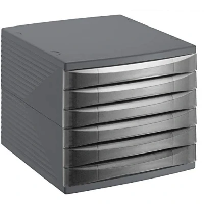 Filing system for the workplace with four drawers in DIN A4 format, multifunctional use for documents, paper, letters, envelopes, handicraft items and much more Convenience: Special stacking devices allow the office boxes to be stacked on top of each other without any problems and can thus be expanded as a filing system as required Properties: The drawer set made of high-quality plastic (PS) is particularly suitable as a clearly arranged storage place for office supplies - drawers also suitable for folders and viewable files Dimensions: 36.5 x 28 x 25 cm (LxWxH), individual drawer: approx. 33 x 24 x 4.5 cm (LxWxH), colour: anthracite casing and drawers Scope of supply: 1x system box for the office, home office, children's room with 6 drawers - made in Switzerland