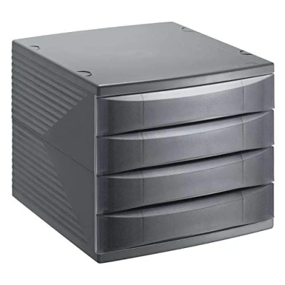 Workstation file system with four drawers in DIN A4 format, multifunctional for documents, paper, letters, envelopes, craft items and much more Convenience Special stacking devices allow office boxes to be stacked seamlessly on top of each other and can therefore be expanded as a storage system if required. Properties The drawer set made of high-quality plastic, PS is suitable as a clear storage space for office supplies; the drawers are also suitable for visible folders and files Dimensions 36.5 x 28 x 25 cm, L x W x H; single drawer 33 x 24 x 4.5 cm, L x W x H; format DIN A4; colour anthracite grey case and drawers Box contents: 1 set box for office, home office, children's room with 4 drawers; made in Switzerland With 4 drawers Colour: anthracite Material: Plastic