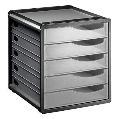 Filing system for the workstation with five closed drawers in DIN A4 format, multifunctional use for documents, paper, letters, envelopes, etc Comfort: drawer system offers practical divided storage compartments at the top for paper clips, pens etc - additional pull-out stop for the drawers Properties: The set of drawers made of high-quality plastic (PS) is particularly suitable as a clear shelf for office supplies - the contents can be recognised at any time thanks to the transparent drawers Dimensions: approx. 33 x 28.5 x 32 cm (LxWxH) - Colour: Housing grey, drawers transparent Scope of supply: 1x system box high quality for the office with 5 drawers - made in Switzerland With 5 drawers Colour: transparent Material: Plastic