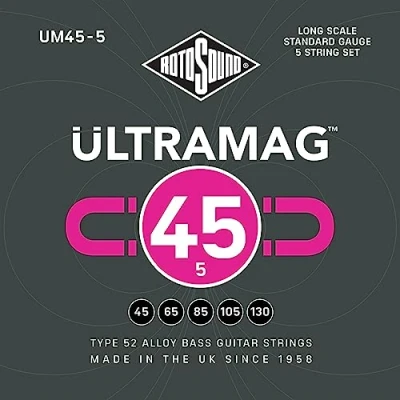 Ultramag, highly magnetic type 52 alloy More power, sustain and longer life than nickel or steel strings Long scale (34"/860mm) - also suitable up to medium (32"/810mm) High energy within reach! "With a composition of 52% nickel and 48% iron, this highly magnetic string emphasises the mids and basses over regular steel strings. Rotosound strings for electric bass ULTRAMAG 52 ALLOY ROUNDWOUND 5-str. UM45-Standard 45-130
