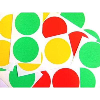50mm Round Colour Code Stickers Choose from 8 stickers of each colour (24 labels total) or 16 stickers of each colour (48 labels total) Colours - Red, yellow and green Label size 50mm round (2") - Paper labels with standard permanent adhesive Supplied on small sheets in handy packs