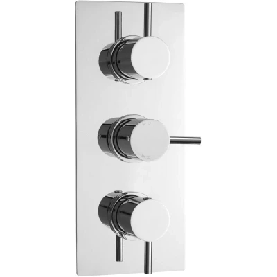 General description This Round Concealed Triple Thermostatic Shower Valve (2 Outlets) in Chrome by Balterley combines high-quality manufacturing and materials, making it a contemporary addition to any bathroom. With its chrome finish, it complements a variety of bathroom designs while providing thermostatic control and excellent flow rates. Manufactured from durable brass and ABS, this valve ensures reliability and longevity. Technical specifications Type: Triple thermostatic shower valve Finish: Chrome Material: Brass and ABS Number of outlets: 2 Other information Modern handle design
