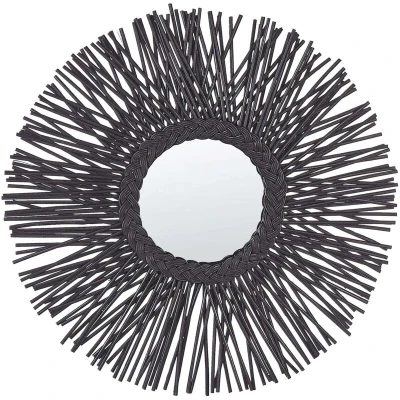 Round Modern Rattan Frame Wall Mirror Sunburst Braid ø 60 cm Black Kalasin