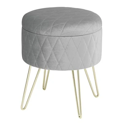 Comfortable - This Light Grey Ottoman chair is covered with soft Velvet and well padded with high density foam, which makes the seat of the stool silky and full of elasticity, easy to revert to its original shape. The perfect hardness relieves the pressure on your hip and lower back, brings you a long relaxing time. Functional and Multi-purpose - Designed with a diameter of 31.5cm and height of 36cm, which is a perfect as a stool, footstool or a dressing table stool in your bedroom. Even can be a chair for party when in need. You deserve a piece like it-taking up little space but multifunctional. Long-lasting Life - The base of the ottoman pouffe is made of gold steel, which is robust and stable, shine and eye-catching and weight capacity is up to 150kgs. Upholstered seat covered with soft and delicate velvet. This kind of material is not easily deformed, hard-wearing, dirt-proof and long colourfast. Considerable and Practical design - The padded seat was designed with a round shape with practical storage use, in this way, you can store magazines, books and other small items. Hassle Free - Easy to assembly in seconds. You do not need to worry if it is hard to set up or is it expensive to ask someone for help.