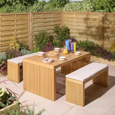 AmazonDurable Eucalyptus hardwood construction Contemporary slatted design Set comprises of tables and two benches, comfortably seats four people UV treated cushions included light grey colour, for indoor or outdoor use, factory applied furniture oil based wood stain All timber sustainably sourced meeting all stringent legislation, comprehensive instructions and all fittings included