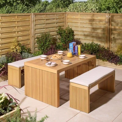 General description The Rowlinson Kyoto 4 Seat Dining Set is a contemporary dining set designed for up to four people, featuring a unique design with horizontal slats that enhance the modern aesthetic of any dining area. This versatile set is suitable for both indoor and outdoor use and comes with cushions for added comfort. Technical specifications Table dimensions: Height: 755mm, Width: 1500mm, Depth: 900mm Bench dimensions: Height: 450mm, Width: 1200mm, Depth: 400mm Cushion thickness: 50mm Material: Durable Eucalyptus hardwood UV treated cushions in light grey Sustainably sourced timber Installation Comprehensive instructions and all fittings are included for easy assembly. Usage This dining set is perfect for both indoor and outdoor dining experiences, accommodating up to four people comfortably.
