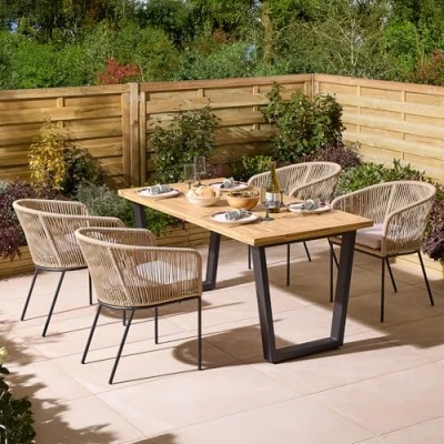 AmazonFive piece set comprising of a table and four chairs Durable Acacia hardwood table top with powder-coated steel legs Chairs with contemporary rope weave design over a powder-coated steel frame, 65mm thick seat pads included - Light grey colour Adjustable table feet for easy levelling on uneven surfaces, for indoor or outdoor use, factory applied furniture oil based wood stain All timber sustainably sourced meeting all stringent legislation, comprehensive instructions and all fittings included