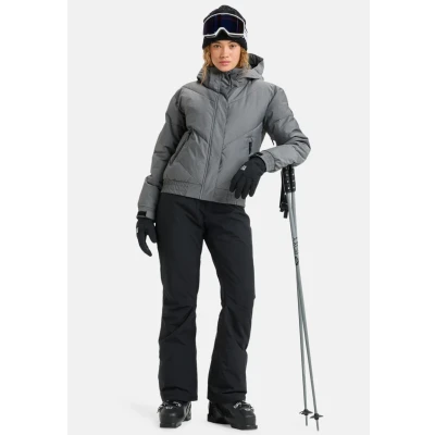 Roxy Snow Shimmer insulated ski jacket for women. An insulated outer layer designed for skiing and general winter use, combining weather protection with a regular, easy fit. The jacket is built from a 3 layer breathable fabric blend of polyester and nylon with a durable water repellent finish. It has a waterproof rating of 10 000 mmH2O and a breathability rating of 5 000 g/m²/24h. The membrane and fabric construction provide reliable protection from snow and light to moderate rain while allowing moisture to escape during activity. The DWR treatment is PFC free. Functional details focus on weather sealing and comfort. The high collar and fixed hood give added protection against wind and falling snow. The insulated construction provides warmth without excessive bulk, making the jacket suitable for layering over base and mid layers on colder days. The regular fit offers freedom of movement for skiing and other winter sports. Overall the Roxy Snow Shimmer insulated ski jacket for women presents a practical balance of insulation, waterproofing and breathability, suitable for resort days and everyday winter wear.