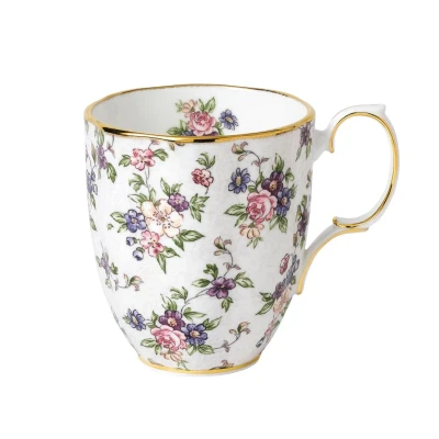 Royal Albert 100 Years of Royal Albert 1940 English Chintz Mug - In celebration of Royal Albert's 100th anniversary, a specialist collection has been envisioned to commemorate the company's longevity and commitment to excellence. Each piece in the collection is decorated using a pattern and design representing some of the most iconic styles and colours of each decade. Typical of the style most popular in the 1940s, the 1940 English Chintz Mug is decorated in a rich tapestry of roses, forget-me-nots and violets on daintily designed fine bone china.