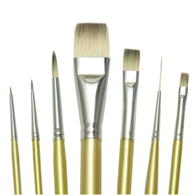 Classed as our highest quality available. Synthetic, Multi-Diameter Hair Nickel Plated Brass Ferrule. Gold Acrylic Handle with Beveled Edge.