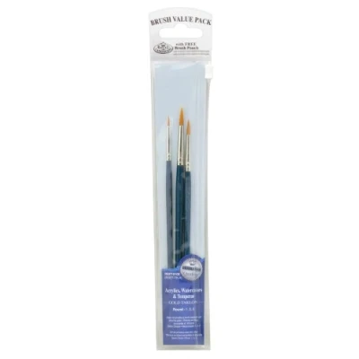 Royal and Langnickel GOLD Taklon value pack Watercolour, acrylic & tempera Contains: 1, 3, 5 Round Re-useable plastic pouch Pack of 3