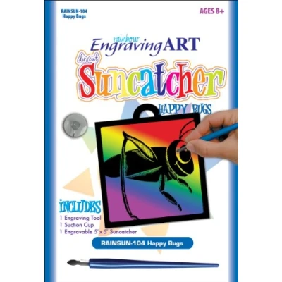 Artwork dimensions 5 inches x 5 inches (127 mm x 127 mm) Rainbow engraving art Contents:- 1 pre-printed sun catcher, 1 suction cup, 1 scraper tool Happy bugs designs