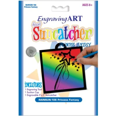 Artwork dimensions 5 inches x 5 inches (127 mm x 127 mm) Rainbow engraving art Contents:- 1 pre-printed sun catcher, 1 suction cup, 1 scraper tool Princess fantasy designs