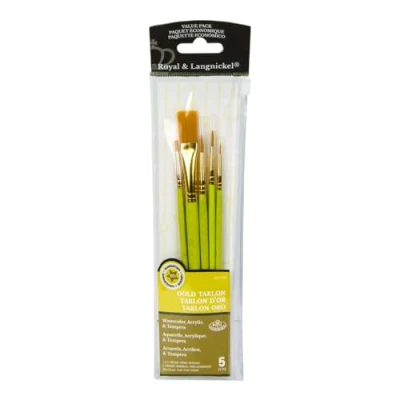 Royal and Langnickel Zip N' Close 5 piece Brush Set Gold Taklon Rounds 1, 3, 5, Shade 2, Flat 5/8 inch
