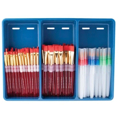 Colorful brushes feature durable acrylic handles with soft, no-slip rubber grips 12 plastic aprons protect clothing when painting 72 brushes includes 24 each of size 4 inch, 8 inch and 5/8 inch flat brushes Brushes are stored in a case for convenient storage and class distribution