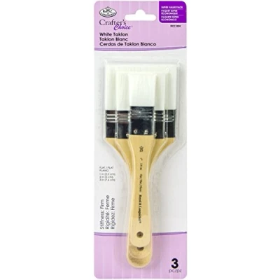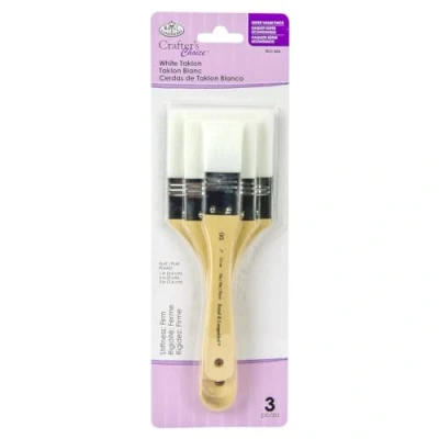 White Taklon large area brushes offer firm hair and allow for even paint application These brushes are ideal for matte, satin, glitter finishes and much more This 3.875x11.875 inch package contains three wooden handled white taklon brushes: one 1 inch flat brush, one 2 inch flat brush, and one 3 inch flat brush