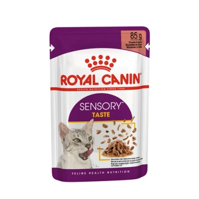Due to their carnivorous predisposition, cats are sensitive to the meaty flavours associated with savouriness; so even though their taste range is small, they still have a perceptive sensitivity to taste. ROYAL CANIN® Sensory Taste is specially formulated with specific savoury flavours to stimulate and appeal to your cat’s distinctive sense of taste, while supporting optimal health and wellbeing through sensorial variation. This formula is specifically designed to match the optimal Macro-Nutrient profile that is instinctively preferred by adult cats. This formula also contains a combination of nutrients that help support the health of your adult cat’s urinary system. To cater to each cat’s individual preferences, ROYAL CANIN® Sensory Taste is also available with morsels in jelly for optimal texture variety. Other products in the ROYAL CANIN® Sensory range include Sensory Smell and Sensory Feel, each with its own attractive formula to stimulate your cat’s appetite and create a sensorially rich feeding experience. Mixed feeding both wet and dry food gives your cat a variety of textures, helping to further stimulate their appetite. Be sure to follow the correct rationing amount to ensure healthy portions.Taste StimulationStimulates cats’ distinctive sense of taste.Sensorial StimulationCats’ well-being is enhanced when their diet provides sensorial variation. ROYAL CANIN® SENSORY stimulates cats’ senses and enhances their feeding experience.Instinctively PreferredFormulated to match the optimal Macro-Nutrient Profile instinctively preferred by adult cats.Urinary HealthHelps support a healthy urinary system.Although cats have very few taste buds meaning their sense of taste isn’t the strongest, it is still uniquely specialised. Due to their carnivorous predisposition, cats are sensitive to the meaty flavours associated with savouriness; so even though their taste range is smaller, they still have a perceptive sensitivity to taste. Your cat’s health and wellbeing is enhanced when their diet is not only nutritious, but sensorially varied too. ROYAL CANIN® Sensory Taste formulas are crafted with powerful flavours characterised by toasted, meaty, and caramelised traces that stimulate your cat’s unique sense of taste, turning their feeding ritual into a sensorially-rich experience. To cater to each cat’s individual preferences, ROYAL CANIN® Sensory Taste is also available with morsels in jelly for optimal texture variety. Other products in the ROYAL CANIN® Sensory range include Sensory Smell and Sensory Feel, each with its own attractive formula to stimulate your cat’s appetite and create a sensorially rich feeding experience. This formula is specifically designed to match the optimal Macro-Nutrient profile that is instinctively preferred by adult cats. This formula also contains a combination of nutrients that help support the health of your adult cat’s urinary system. Mixed feeding both wet and dry food gives your cat a variety of textures, helping to stimulate their appetite even more. A diet that is a mixture of wet and dry food is also a good option for fussy eaters. Be sure to follow the correct rationing amount to ensure healthy portions. The Sensory™ wet range can be integrated into the mixed feeding routine of all our Feline Health Nutrition Adult dry products. At ROYAL CANIN® we’re committed to providing nutritional solutions to your pet’s needs. All of our products undergo an extensive quality control process in order to guarantee the optimum quality of food as well as catering to your cat’s specific dietary requirements and lifestyle. This means that when your cat eats ROYAL CANIN® Sensory Taste, it’s getting a complete and balanced diet.Additives: Vitamin D3: 130 IU, Iron (3b103): 5 mg, Iodine (3b202): 0.35 mg, Copper (3b405, 3b406): 2.8 mg, Manganese (3b502, 3b503, 3b504): 1.6 mg, Zinc (3b603, 3b605, 3b606): 16 mg.Compostion: Meat and animal derivatives, vegetable protein extracts, cereals, minerals, derivatives of vegetable origin, yeasts, oils and fats. Crude ash: 1.6%. Crude fibre: 0.5%. Crude oil fats: 2.8%. Moisture: 79.5%. Protein: 11.5%.Sensory Taste is suitable for adult cats over 12 months old. Stimulates cats’ distinctive sense of taste.Taste StimulationStimulates cats’ distinctive sense of taste.Sensorial StimulationCats’ well-being is enhanced when their diet provides sensorial variation. ROYAL CANIN® SENSORY stimulates cats’ senses and enhances their feeding experience.Instinctively PreferredFormulated to match the optimal Macro-Nutrient Profile instinctively preferred by adult cats.Urinary HealthHelps support a healthy urinary system.AdditivesVitamin D3: 130 IU, Iron (3b103): 5 mg, Iodine (3b202): 0.35 mg, Copper (3b405, 3b406): 2.8 mg, Manganese (3b502, 3b503, 3b504): 1.6 mg, Zinc (3b603, 3b605, 3b606): 16 mg.CompostionMeat and animal derivatives, vegetable protein extracts, cereals, minerals, derivatives of vegetable origin, yeasts, oils and fats. Crude ash: 1.6%. Crude fibre: 0.5%. Crude oil fats: 2.8%. Moisture: 79.5%. Protein: 11.5%.Technical Specification:Product Type: WetProduct Species: CatProduct Lifestage: AdultTarget Age From (months): 12Target Age To (months): 84Target Size From (kg): 3Target Size To (kg): 6Dimensions: Length: 195mm x Height: 145mmWeight: 0.085Kg