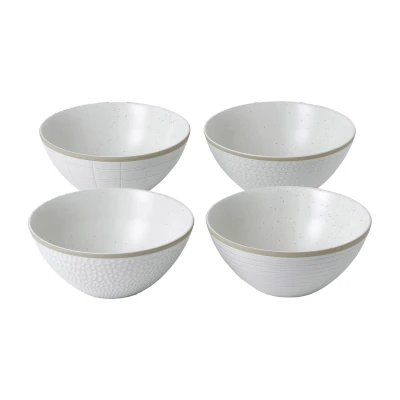 Royal DoultonThe mixed set of four glazed stoneware bowls in soft white includes each one of the distinctive undulating textures; inspired by elements of the relaxed décor in Gordon Ramsay’s Maze Grill restaurants. With a hand-crafted, rustic feel the bowls form a striking set in this contemporary, laid back collection designed for everyday relaxed dining moments with family and friends. Packaged in a signature ‘Royal Doulton exclusively for Gordon Ramsay’ presentation box, they also make an ideal gift.