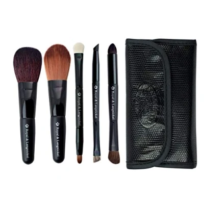 Great on the go cosmetic set Five mini cosmetic brushes Three of these brushes are double ended Eight brush heads in total Faux leather case with clear zipped compartment