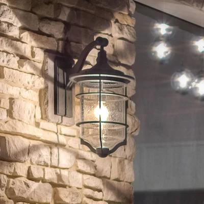 Net LightingThis outdoor range features a traditional lantern design with a slightly more modern shape. The Distressed black finish gives the fitting a bold feel, which is contrasted by its clear seeded glass panes. This offers wall lights in two different sizes, and a matching pedestal light. The fittings are complete with a limited three year anti-corrosion guarantee.