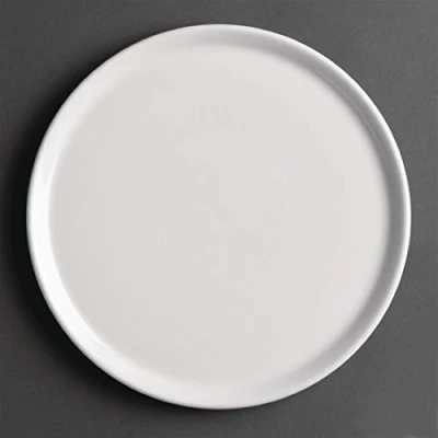 18.5(H) x 255(Ø)mm . ¾(H)" x 10(Ø)". Porcelain. White. Safe to wash in your commercial dishwasher. Flat surface that is ideal for serving pizzas and flatbreads. Small lid on edge prevents food falling off.