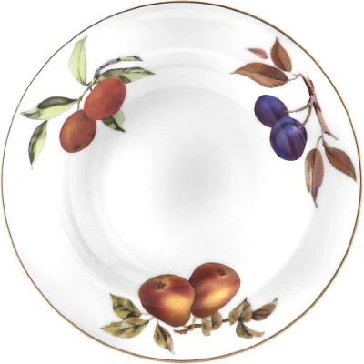 The Evesham pattern is highly collectible in the U.S. market, introduced in the 1960's. It is beautiful and practical, used for both formal and informal dining. The Evesham rim bowl is an important addition to the place setting and is used to serve soup, stew or pasta. Because Evesham is made of durable fine porcelain, it is oven and freezer safe. Hand washing with mild detergent is recommended to protect the gold band. 9 inch diameter, Weight: 2.15 pounds, Manufacturer: Royal Worcester