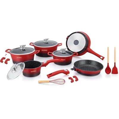 ROYALTY LINE, Set of 17 Pieces, Cast Aluminum cookware, Marbled Coating, with Removable Silicone Handles, Compatible All Heat Sources, 24 28 cm, Red