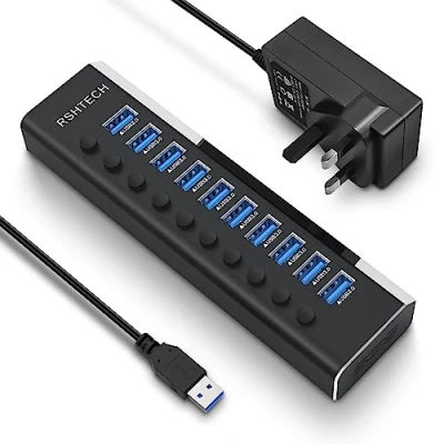 10-Port USB 3.0 Hub Extension: RSHTECH usb splitter expand 1 USB 3.0 port to 10 external USB 3.0 data ports for mobile hard drive, USB flash drive, mobile phone, tablet PC, card reader, MP3/4 player, Transmission speed Up to 5Gbps and backward compatible with USB 2.0 / 1.1 Broad Compatibility: Instantly add 10 USB 3.0 high speed ports extension to your computer, laptop. Compatible with Windows/Mac OS/Linux Aluminum USB 3.0 Splitter: Aluminum alloy casing and compact USB port design make your desktop neat and stylish. Powered usb hub supports plug and play. No driver is required Convenient On/Off Switches: RSHTECH USB hub is equipped with individual on/off switches for each USB 3.0 port, allowing you to quickly and easily turn ON/OFF USB port. Reduces the hassle of repeatedly unplugging and unplugging USB devices Package Including: RSHTECH 10 Port Hub with Individual Switches, 1m USB 3.0 Cable, 12V/3A Power Adapter and User Manual
