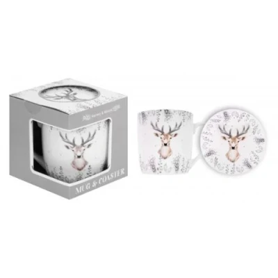 RSW Christmas Stag Mug and Coaster Set 350ml Bone China Gift Idea for Xmas Themed Mug, UK Design, Hot Drinks, Tea, Coffee