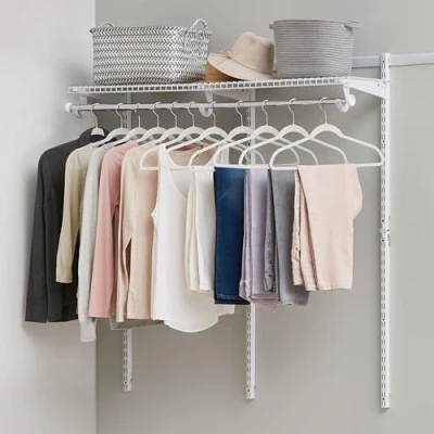 DOES THIS FIT MY CLOSET?: Fits any walk in or reach in closet that is 2-4 ft wide. EASY INSTALLATION: All mounting hardware included for easy installation, no cutting required. HIGH QUALITY MATERIALS: Virtually maintenance-free epoxy finish reduces snag points and never rusts. STORAGE FROM WALL TO WALL: Telescoping rods and expandable shelves adjust to add additional shelving and hanging space and shelving is adjustable to enable shelf height to vary. EASY TO REARRANGE: Modular design enables kit to be assembled in a variety of configurations to meet storage needs and design preferences, reassemble the closet to a new configuration without any tools as storage needs change. UNINTERUPTED HANGING SPACE: Hang rods can be used separately or telescoped together to enable hangers to freely glide along the closet kit. USE PLACES: Fit everything from shoes and clothes in the closet or mud room, to storage boxes and tools in the garage or basement. WHAT'S INCLUDED: Closet kit includes (2) 26.25-inch Wire Shelves, (1) 26" Inner Clothes Rod, (1) 26" Outer Clothes Rod, (4) Clothes Rod Hangers, (4) 12" Shelf Brackets, (6) 25-inch Uprights, (2) 24-inch Hang Rails, (2) Hang Rail Covers., Weight: 14.15 pounds, Manufacturer: Rubbermaid