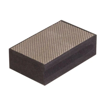 General description This diamond polishing pad is designed for grinding and smoothing edges of natural stone and ceramic tiles. It is semi-flexible with a rubber EVA body that adapts well to the hand, featuring a grip area with a side groove to improve ergonomics and reduce hand fatigue during use. Suitable for manual work in hard-to-reach areas such as internal corners, concave zones, or finishing cut edges. Technical specifications Grit sizes: #60, #120, #200 for rough shaping, and #400 for polishing Polishing pad dimensions: 55 x 90 mm Rubber support dimensions: 58 x 94 x 30 mm Installation Wet use is recommended; can also be used dry Moisten the pad or the material being polished for best results Usage For roughing and edge polishing on surfaces of natural stone and ceramic tile For optimal results, use all grit sizes progressively from coarse to fine During grinding, move from the top (visible side) to the bottom to avoid damaging the material