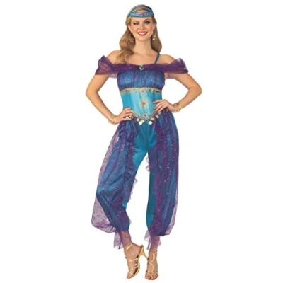 Rubie's opus collection through the ages adult costume Blue and purple jumpsuit with off the shoulder sheer purple sleeves and thin blue straps; gold accents on bodice and attached purple glitter ruffles on legs; matching blue and purple headpiece Important: costumes are not sized the same as apparel, consult the Rubie's adult women's size chart and reviews before making a selection; do not buy based on clothing size Groups/families: search for Arabian dancer and sultan costumes for themed dress up fun Family-owned, family-focused, and based in the U.S.A. Since 1950, Rubie's has classic and licensed costumes and accessories in sizes and styles for your entire family, Manufacturer: Rubie's