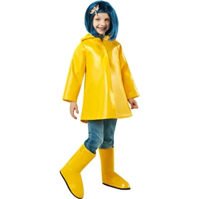 Officially licensed Coraline costume, look for trademark on label and packaging to help assure you've received authentic safety-tested item Coraline Child Size Rain Jacket, Boots and Costume Wig Important: costumes are sized differently than apparel, use Rubie's Child Size Chart image, do not choose based on child's age or clothing size Coraline looks available for kids and adults for a fun family costume, Manufacturer: NECA