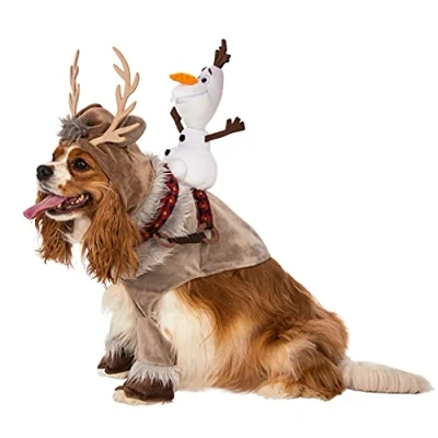 OFFICIALLY LICENSED Disney pet costume, look for trademark on label and packaging to help assure you've received authentic safety tested item Sven costume is a headpiece and shirt with attached tail, attached mini Olaf rider IMPORTANT! NOT ALL COSTUMES WILL FIT ALL PETS, consider costume style as well as animal size and shape READ THE RUBIE’S PET SIZE CHART and WATCH THE SIZING INSTRUCTION VIDEO, do not select size based on breed Fun for photos, parades, play dates, and more